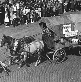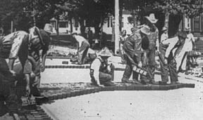 Loren Wade says his father, Joe Wade, then 25 years of age, was a crew foreman for one of the paving contractors. And Loren recalls being told that his uncle, Roy Wade, also a bricklayer, walked off the job at age 17 on the day Loren was born, July 25, 1912. Roy worked for his father but Loren doesn't know the reason for his quitting.